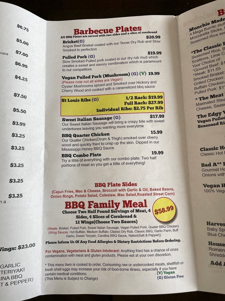 Barbecue PlatesEach BBQ Plate is served with Two Sides and 1 Slice of Cornbread Please visit our website for prices